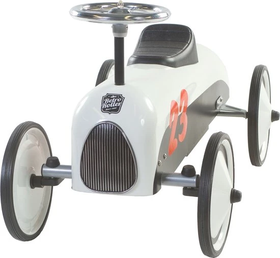 Prachtige duo-tone Retro Roller loopauto in zwart-witte kleurstelling. Urenlang speelplezier voor zowel binnen- als buiten gegarandeerd. De loopauto is voorzienvan metalen wielen en rubberen banden en een kunststof zitting. Leuk als verjaardagscadeau, maar ook heel leuk als woonaccessoire! De loopauto is volledig van metaal en eenvoudig in elkaar te zetten en te monteren. Jouw kindjekan zó opstappen en karren maar! Geschikt voor kinderen vanaf 24 maanden. Afmeting: 75 x 40 x 40cm. Draaggewicht: 20 kg